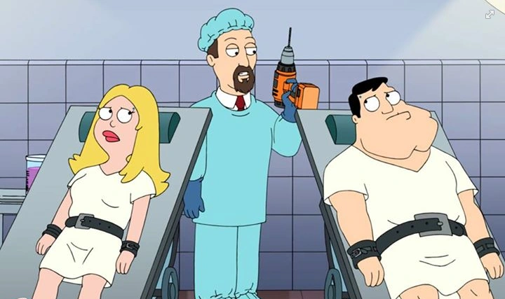 He goes to Francine and she gets angry about being committed, although Stan tries to brush it off until Francine blurts out that she hates him repeatedly, getting herself re-committed in the process. Stan visits and her doctor tells him that he is the one setting her off. However, Stan's insists in seeing her and tries to break into the hospital to free her. Finding out that she is at the hospital talent show, he locates her and tries to create a distraction to slip her out. But he has to perform in place of a patient that he knocks out. As he tries to drop instructions to Francine about his escape plan, she is unresponsive due to being heavily medicated. When the orderlies find out that it is Stan, he drops his disguise and runs with her in her wheelchair towards the exit. However, he gets tranquilized and they awake in a hospital operating room. The doctor arrives and tells them that they are due for lobotomies for being disruptive. As the doctor drills Stan's skull, he loses his cognitive ability.