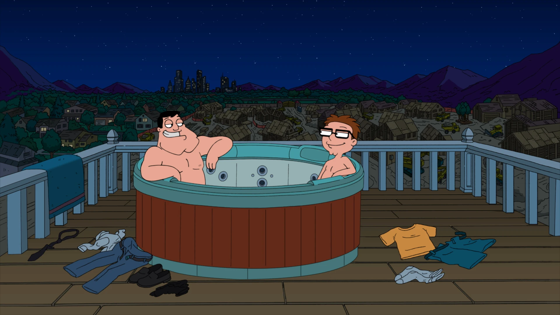 Meanwhile, Stan returns home to find his door plastered with fliers. When he spots one for Hillside Acres, a new gated real estate community which promises no fliers tacked to doors. He becomes interested in the property and takes Steve along to check it out. After they break in, they encounter the caged guard dogs but are distracted by a dream home. Showing the place off for Steve who is unimpressed by the place, Stan gets him to imagine his own jacuzzi and sun deck and wins him over. When pretending to soak in the new hot tub, security arrives and releases the guard dogs who promptly attack Steve and Stan. Barricading themselves in the house, Stan insults the dogs and they climb in through the fireplace, chasing the pair until they catch Stan and maul his leg, until they manage to escape to the sun deck and barricade themselves again. Down to their last nail, Stan starts to take Steve out to spare him from the dogs when he spots a propane tank. Firing at the tank to scare off the dogs by the explosion, they succeed but find they have also set off the main gas line. Jumping into the hot tub, they ride it on the blast from the gas explosion but find the dogs still following by riding a board. Dodging to the side, they crash at the gates where Stan becomes annoyed that the mailboxes are located so far away from the house and decides he is no longer interested.