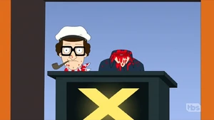 When Steve tries to come up with an idea for a school talent show act in "The Talented Mr. Dingleberry" after his singing is sabotaged, Roger pitches becoming his ventriloquist dummy. He shows off a scrapbook of his former act which includes several game show appearances. Later, when Roger turns more psychotic than usual, Steve discovers that the scrapbook also contains clippings from where his former partner Dennis was blamed for a series of murders and sent away to the Danvers Asylum for the Criminally Insane. There, he finds Dennis who reassures him that it was indeed Roger who committed the murders, killing the entire cast of Hollywood Squares in order to become the center square. Charles is shown with his head severed.