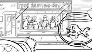 - The scene in the beginning of the episode showing the fate of Klaus' original human body after his mind was swapped with that of a goldfish is slightly different from "Pilot". Notably, the sign changes from a pale color to red and the flags change from orange single-pointed pennants to yellow double-pointed pennants.