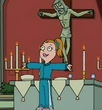 In this episode, we are introduced to the White family. Stan hates the father, Chuck, who always beats the Smiths to church where Chuck gets the shady parking spot and Stan has to park in the sun. At church, the deacon chokes to death on a communion wafer and Chuck volunteers to be deacon. Stan, wanting to beat him, also volunteers. Steve becomes friends with Betsy, Chuck's daughter who has no freedom, is forced to do gymnastics and is not even allowed to hold hands with boys as it leads to kissing and could end with pregnancy, according to Betsy's mother, Christie.