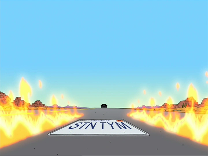 - The license plate on Stan's DeLorean reads "STN TYM", a reference to "Stan Time" as well s a parody of the Back to the Future Delorean's "Outtatime" plate. In addition, Steve leaves gasoline behind the DeLorean and unscrews the car's license plate is so he can leave a fiery trail and have the license plate spin off as in the film. Mr. Kirkoff is dressed as Marty McFly and an instrumental version of Johnny B. Goode playing during the episode's climax. Also during the climax, Joel McNeely plays music similar to Alan Silvestri's score from Back to the Future.