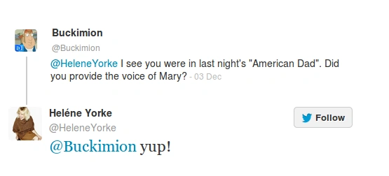 Heléne provides the voice of Mary Smith in "Dreaming of a White Porsche Christmas" as well as having a voice credit in "Blonde Ambition".
