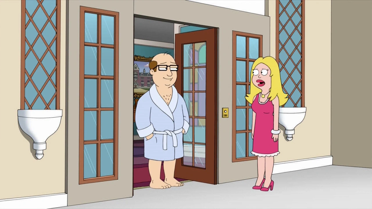 When Roger, who has come to feel like he is nobody without his invented personas in "The Dentist's Wife", is inspired by Meredith to be anyone he wants, he chooses to be Meredith herself since she is real. He manages to take over her life, sending her off on a barge and even fools Jerry. Francine's attempt to talk some sense into him results in him sending her off on a barge as well. They meet up on the barge at set off to stop Roger at a charity gala, where he is introduced by Jerry prior to their arrival.