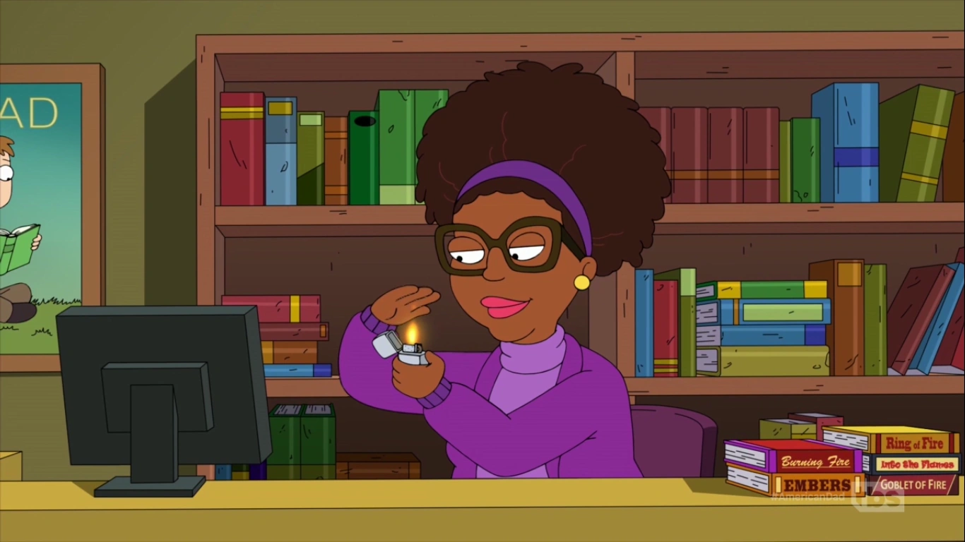 In "Flush After Reading", the family makes note of Francine's trips to the library and speculate on her actual whereabouts. But when Stan's CIA tracker reveal she's actually going to the library he rushes to stop her from becoming a 'nerd'. At the library, Francine greets Jolene who has placed new books in the restroom for her. Meanwhile, Roger and Rogu figure out she's going there to use the restroom and Roger becomes determined to find out why. He manages to locate Francine before Stan does, and uses a power of his to transport them into the books to hide from him.