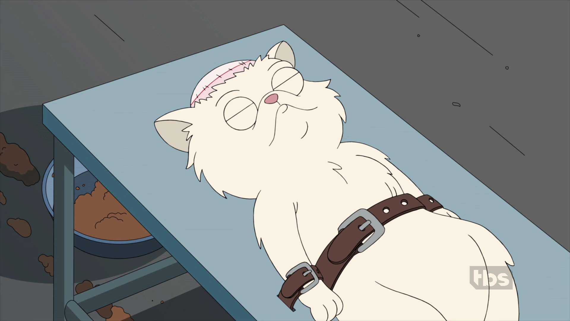 But when their plans are interrupted by the timely visit of Francine and Stan, they slip Stan a sleeping pill and decide to use Hayley and Francine instead for themselves, and give their cat Mr. Poopy's brain to Jeff's body. After convincing Eunice and Milford's deformed handyman Morbo to help the family escape, Jeff scratches his ear with his leg and starts to purr as they head out the door.