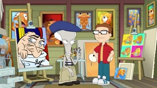 Without his muse, Roger's artwork and life goes on the skids, while Klaus recovers nicely. The latter finds him in his dumpster at work, but rejects his invitation to return to the art studio. Undeterred, Roger breaks into Klaus' new family home and begs him to come back. Urged by his family to show some compassion and allow him to stay for a meal, he confesses that he's never been happier since he's gotten away from Roger's influence. Having hit rock bottom in front of his old friend, Roger invites him and his family to his new art show, where he unveils his artwork of a domesticated Klaus, which is thoroughly panned by everyone, including Klaus himself. After driving away his new family in his anger, Roger reveals that the piece secretly hides the real Klaus as he knows him as he decides to drop artwork for heroin.