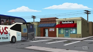 In "Exquisite Corpses", when their bus tour of murder sites of the 'RB Killer' is in danger of receiving a negative review by a Yelp blogger, Francine, Roger and Jeff try to come up with an idea to perk things up. Jeff gets a brainstorm and stops at Radio Shack to buy police band radios to hear of the killer's actions, but Roger instructs him to simply take them because the store is going out of business. The clerk protests that the store isn't closing just as a wrecking ball knocks a hole in the wall. The protests continue with less conviction as a second hole is made.