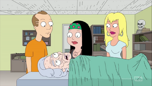 Together, they head to Eunice and Milford's home, where they are encouraged to change into their clothing to replace their rain-soaked outfits, unaware that Milford and Eunice have a secret plan to swap their brains into their younger bodies. To their frustration, Stan and Francine arrive to recover Jeff, but find themselves also trapped in the house due to the pouring rain. Seeking out the bathroom, Stan finds their secret lab, but thinks it's just a man-cave. Tired of Francine and Hayley's bickering, Eunice, who reveals herself to be Constance von Stroheim, an escaped mad scientist along with her husband Wilhelm, commands their deformed handyman Morbo to capture the pair and take them to the lab, having decided to use their bodies instead and use Jeff for their cat, while slipping Stan a pill to make him sleep. As Hayley apologizes while Constance is distracted by Morbo, Francine is able to remind her that they both share being double-jointed before the drugs knock her out. Hayley is able to use this to slip out from her shackles and knock Constance away from slicing into her mother's skull. Constance tries to send Morbo after Hayley, who reminds him of the beatings he's suffered at her hands. He instead turns on Constance and her husband, allowing Francine and Hayley to escape as Stan also recovers. As they all start to leave, Jeff scratches his ear with his leg and starts to purr.