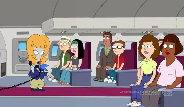 Meanwhile, Roger becomes a flight attendant on Southwest Airlines to perform comedy routines on planes. On a flight, he feels good when he gets a few chuckles, but completely forgets to perform the safety announcement and gets upstaged by Karen, another flight attendant. When Roger tries to make a retort, he insults the passengers instead and realizes he's been embarrassed. Roger invites Jeff, Hayley and Steve along for a free flight. Although they choose Hawaii, Roger insists they go to Ft. Worth with him to laugh at his jokes and top Karen, but his jokes fall flat again despite their attempts to laugh as they fear for themselves. Roger finally has enough of being upstaged and announces that he has sabotaged the plane. Yanking open the aircraft door, he gives Karen one last word that he "kills," but as he leaps from the aircraft, he finds they are on final landing approach and his parachute gets tangled in the landing gear. As the plane stops at the gate, he looks up and celebrates having gotten a laugh out of the passengers as they look down on his battered body.